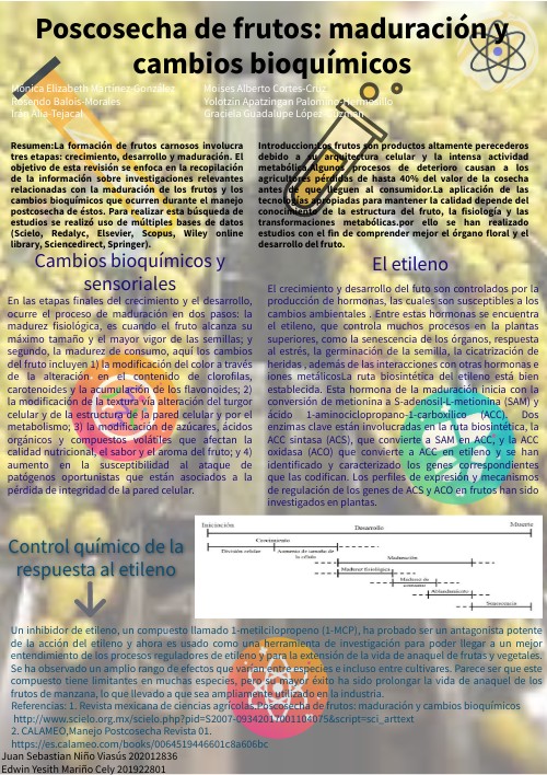 Referencias: 1. Revista mexicana de ciencias agrícolas.Poscosecha de frutos: maduración y cambios bioquímicos http://www.scielo.org.mx/scielo.php?pid=S2007-09342017001104075&script=sci_arttext 2. CALAMEO,Manejo Postcosecha Revista 01. https://es.calameo.com/books/0064519446601c8a606bc