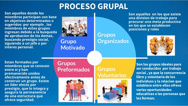 Son los grupos ideales para ser conducidos por trabajo social , ya que la concurrencia libre y voluntaria de los individuos y la relacion que establece entre ellos ofrece varias oportunidades educativas a las personas que los forman.