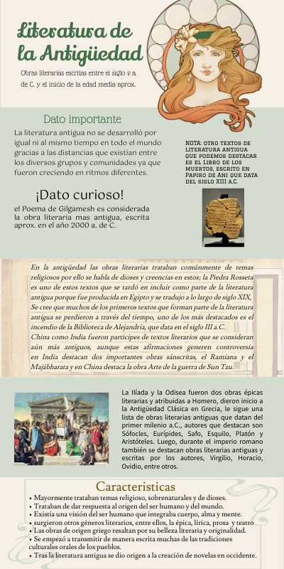 • Mayormente trataban temas religioso, sobrenaturales y de dioses. • Trataban de dar respuesta al origen del ser humano y del mundo. • Existía una visión del ser humano que integraba cuerpo, alma y mente. • surgieron otros géneros literarios, entre ellos, la épica, lírica, prosa y teatro • Las obras de origen griego resaltan por su belleza literaria y originalidad. • Se empezó a transmitir de manera escrita muchas de las tradiciones culturales orales de los pueblos. • Tras la literatura antigua se dio origen a la creación de novelas en occidente.