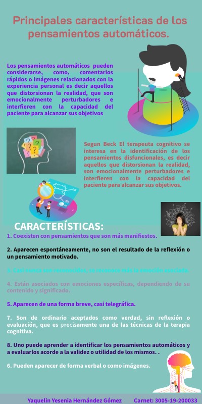 1. Coexisten con pensamientos que son más manifiestos. 2. Aparecen espontáneamente, no son el resultado de la reflexión o un pensamiento motivado. 3. Casi nunca son reconocidos, se reconoce más la emoción asociada. 4. Están asociados con emociones específicas, dependiendo de su contenido y significado. 5. Aparecen de una forma breve, casi telegráfica. 7. Son de ordinario aceptados como verdad, sin reflexión o evaluación, que es precisamente una de las técnicas de la terapia cognitiva. 8. Uno puede aprender a identificar los pensamientos automáticos y a evaluarlos acorde a la validez o utilidad de los mismos. . 6. Pueden aparecer de forma verbal o como imágenes.
