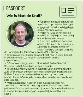 de Koninklijke Militaire Academie (KMA) in Breda. ▪ Is getrouwd met Esther en woont met haar in Laag-Keppel in de Achterhoek. Ze hebben vier kinderen en drie kleinkinderen. ▪ Woont met zijn gezin als militair in het Duitse Seedorf, in Bosnië en in het Amerikaanse Pennsylvania. ▪ Is van november 2008 tot november 2009 commandant in Zuid-Afghanistan en heeft een leger onder zich bestaande uit Britten, Canadezen en Nederlanders van 45.000 man. Is als Luitenant-Generaal commandant van de Landmacht van 2011 tot 2016. ▪ Verdient lokaal zijn sporen door als actievoerder het zwembad te behouden en te ageren tegen de drukte in de pittoreske Dorpsstraat, waaraan hij woont. De voetballiefhebber is al weer jaren voorzitter van de plaatselijke voetbalclub HC’03.