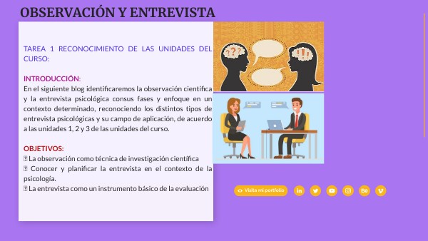 TAREA 1 RECONOCIMIENTO DE LAS UNIDADES DEL CURSO: INTRODUCCIÓN: En el siguiente blog identificaremos la observación científica y la entrevista psicológica consus fases y enfoque en un contexto determinado, reconociendo los distintos tipos de entrevista psicológicas y su campo de aplicación, de acuerdo a las unidades 1, 2 y 3 de las unidades del curso. OBJETIVOS: La observación como técnica de investigación científica