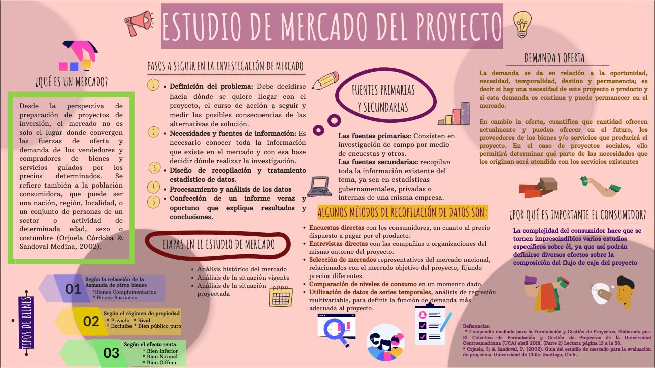 Referencias: * Compendio mediado para la Formulación y Gestión de Proyectos. Elaborado por: El Colectivo de Formulación y Gestión de Proyectos de la Universidad Centroamericana (UCA) abril 2018. (Parte 2) Lectura página 13 a la 56. * Orjuela, S; & Sandoval, P. (2002). Guía del estudio de mercado para la evaluación de proyectos. Universidad de Chile. Santiago, Chile.