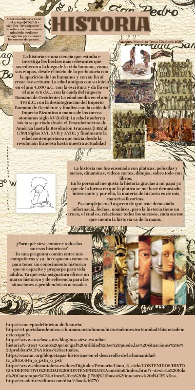 https://conceptodefinicion.de/historia/ https://e1.portalacademico.cch.unam.mx/alumno/historiademexico1/unidad1/historiademexico/queEs https://www.tusclases.mx/blog/nos-sirve-estudiar-historia#:~:text=Como%20principal%20utilidad%20se%20puede,las%20situaciones%20o%20problem%C3%A1ticas%20actuales. https://eacnur.org/blog/etapas-historicas-en-el-desarrollo-de-la-humanidad-tc_alt45664n_o_pstn_o_pst/ https://www.educantabria.es/docs/Digitales/Primaria/Cono_3_ciclo/CONTENIDOS/HISTORIA/DEFINITIVO%20EDAD%20CONTEMPORANEA/misitio9/index.htm#:~:text=La%20Edad%20Contempor%C3%A1nea%20es%20la,(1789)%20hasta%20nuestros%20d%C3%ADas. https://reader.texidium.com/dist/#/book/16770