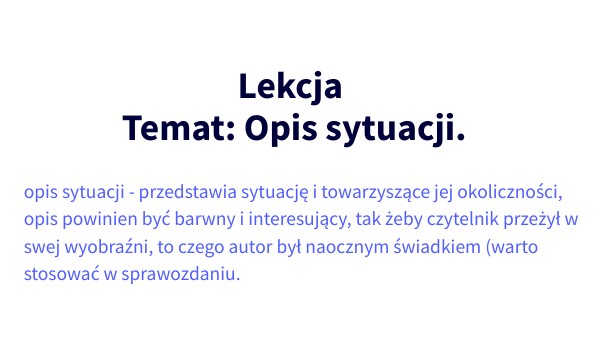 opis sytuacji - przedstawia sytuację i towarzyszące jej okoliczności, opis powinien być barwny i interesujący, tak żeby czytelnik przeżył w swej wyobraźni, to czego autor był naocznym świadkiem (warto stosować w sprawozdaniu.