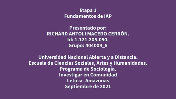 Etapa 1 Fundamentos de IAP Presentado por: RICHARD ANTOLI MACEDO CERRÓN. Id: 1.121.205.050. Grupo: 404009_5 Universidad Nacional Abierta y a Distancia. Escuela de Ciencias Sociales, Artes y Humanidades. Programa de Sociología. Investigar en Comunidad Leticia- Amazonas Septiembre de 2021