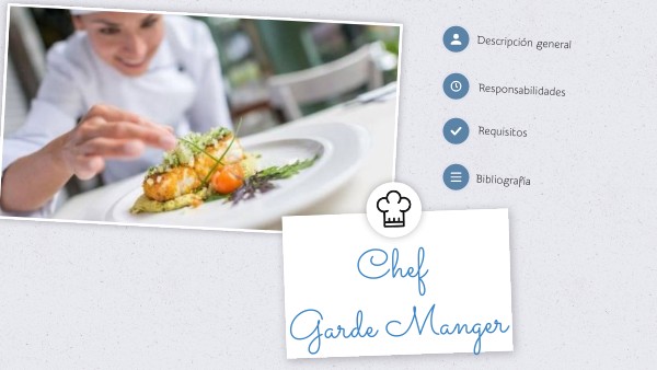 - Todo lo que Debes saber del Garde Manger Chef. Recuperado, 5 de septiembre de: https://grandhotelier.com/garde-manger-chef/ - What is Garde Manger? Recuperado, 5 de septiembre de: https://www.ecpi.edu/blog/what-is-garde-manger - Descripción Del Trabajo Para Un Garde Manger Chef. Recuperado, 5 de septiembre de: https://es.spazziodecor.com/job-description-for-garde-manger-chef-5774 - Job Description for Garde Manger Chef. Recuperado, 5 de septiembre de: https://setupmyhotel.com/job-description-for-hotels/bo-n-others/523-garde-manger-chef.html