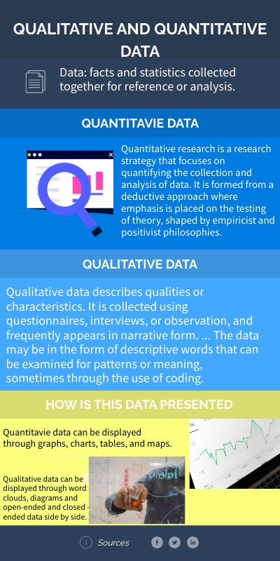 Qualitative data describes qualities or characteristics. It is collected using questionnaires, interviews, or observation, and frequently appears in narrative form. ... The data may be in the form of descriptive words that can be examined for patterns or meaning, sometimes through the use of coding.