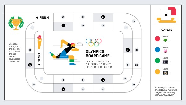 Choose a token, roll the dice and try to reach the goal before anyone else. Good luck!