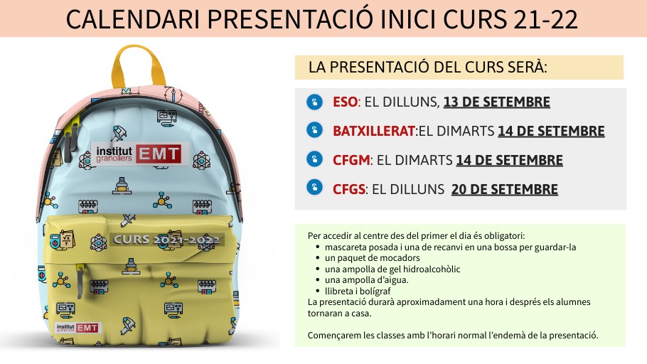 CALENDARI PRESENTACIÓ INICI CURS 21-22