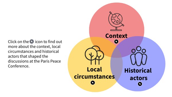 Click on the icon to find out more about the context, local circumstances and historical actors that shaped the discussions at the Paris Peace Conference.