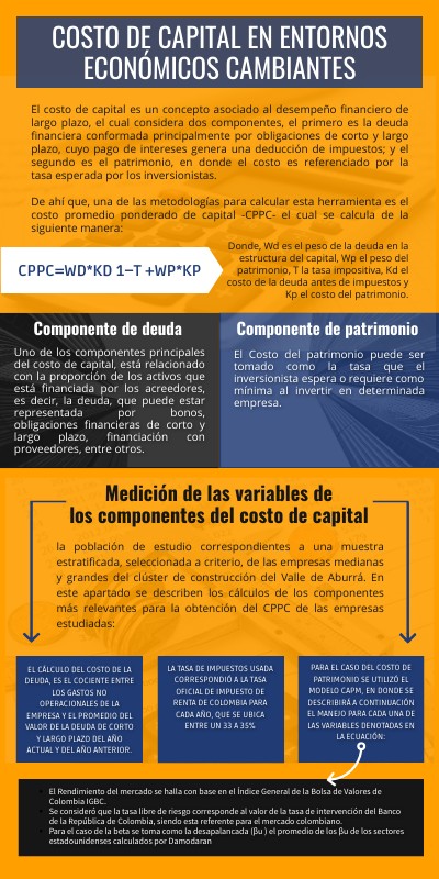 El costo de capital es un concepto asociado al desempeño financiero de largo plazo, el cual considera dos componentes, el primero es la deuda financiera conformada principalmente por obligaciones de corto y largo plazo, cuyo pago de intereses genera una deducción de impuestos; y el segundo es el patrimonio, en donde el costo es referenciado por la tasa esperada por los inversionistas. De ahí que, una de las metodologías para calcular esta herramienta es el costo promedio ponderado de capital -CPPC- el cual se calcula de la siguiente manera: