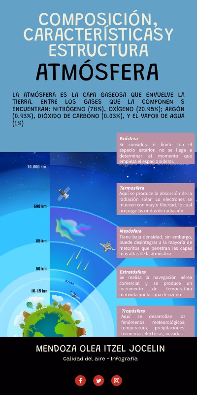 La atmósfera es la capa gaseosa que envuelve la tierra. Entre los gases que la componen s encuentran: nitrógeno (78%), oxígeno (20.95%); argón (0.93%), dióxido de carbono (0.03%), y el vapor de agua (1%)