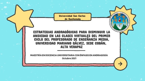 - Fomentar el uso de estrategias andragógicas como medios y técnicas para disminuir la ansiedad en las clases virtuales de los estudiantes del primer ciclo del Profesorado de Enseñanza Media, Universidad Mariano Gálvez, sede Cobán, Alta Verapaz