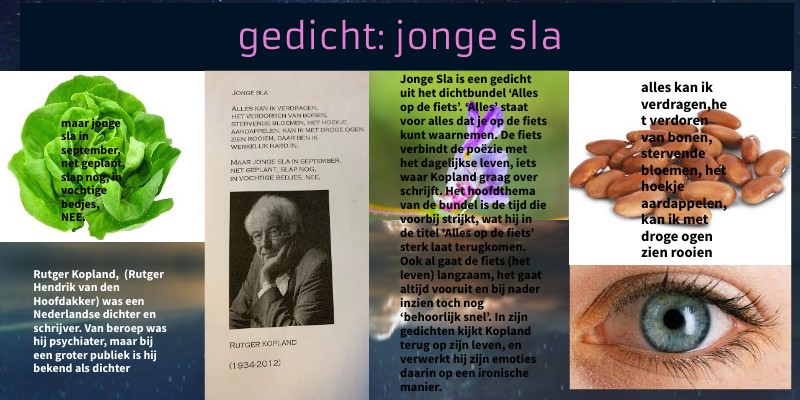 Jonge Sla is een gedicht uit het dichtbundel ‘Alles op de fiets’. ‘Alles’ staat voor alles dat je op de fiets kunt waarnemen. De fiets verbindt de poëzie met het dagelijkse leven, iets waar Kopland graag over schrijft. Het hoofdthema van de bundel is de tijd die voorbij strijkt, wat hij in de titel ‘Alles op de fiets’ sterk laat terugkomen. Ook al gaat de fiets (het leven) langzaam, het gaat altijd vooruit en bij nader inzien toch nog ‘behoorlijk snel’. In zijn gedichten kijkt Kopland terug op zijn leven, en verwerkt hij zijn emoties daarin op een ironische manier.