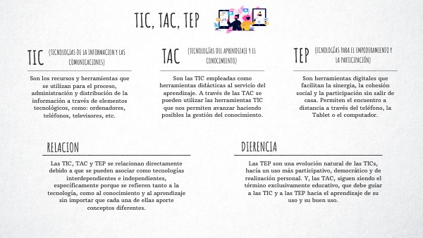 Las TIC, TAC y TEP se relacionan directamente debido a que se pueden asociar como tecnologías interdependientes e independientes, específicamente porque se refieren tanto a la tecnología, como al conocimiento y al aprendizaje sin importar que cada una de ellas aporte conceptos diferentes.