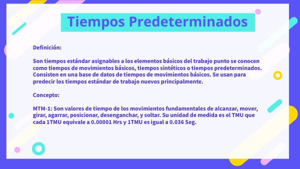Definición:Son tiempos estándar asignables a los elementos básicos del trabajo punto se conocen como tiempos de movimientos básicos, tiempos sintéticos o tiempos predeterminados. Consisten en una base de datos de tiempos de movimientos básicos. Se usan para predecir los tiempos estándar de trabajo nuevos principalmente. Concepto: MTM-1: Son valores de tiempo de los movimientos fundamentales de alcanzar, mover, girar, agarrar, posicionar, desenganchar, y soltar. Su unidad de medida es el TMU que cada 1TMU equivale a 0.00001 Hrs y 1TMU es igual a 0.036 Seg.