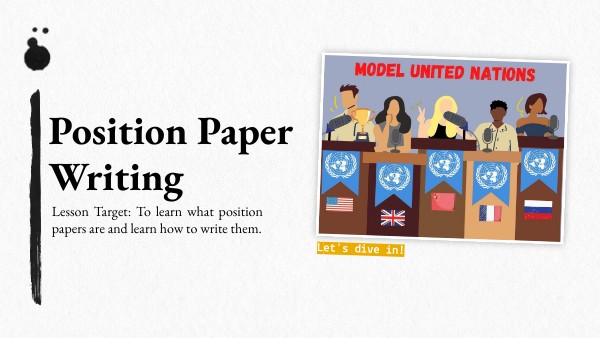 What is it? It's a document that intends to cover the description of assigned topic, your country’s position in regards to topic, and the proposition of possible solutions. Why write one? It will give you a clear idea on the issue you will discuss at CIMUN and it will prepare you for it! Which skills will you put into practice? Research, critical thinking and analysis, and, more importantly, good writing and editing skills!