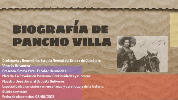 Centenaria y Benemérita Escuela Normal del Estado de Querétaro."Andrés Balvanera". Presenta: Emma Yareli Escobar Hernández. Materia: La Revolución Mexicana: Continuidades y rupturas. Maestro: José Juvenal Bautista Ontiveros. Especialidad: Licenciatura en enseñanza y aprendizaje de la historia. Quinto semestre Fecha de elaboración: 08/09/2021.