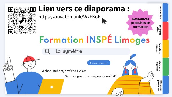 "En cycle 2, la notion de symétrie axiale est abordée sous son aspect global à travers des figures qui présentent un axe de symétrie. En cycle 3, l'étude de la symétrie axiale s'élargira à la transformation qu'opère une symétrie sur une figure et aux propriétés géométriques conservées par symétrie." Cap maths CE1, guide pédagogique