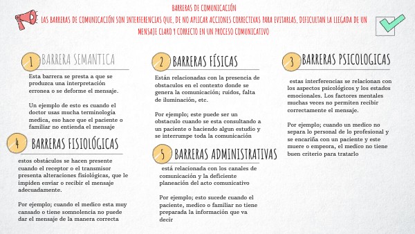 Esta barrera se presta a que se produzca una interpretación erronea o se deforme el mensaje.Un ejemplo de esto es cuando el doctor usas mucha terminología medica, eso hace que el paciente o familiar no entienda el mensaje