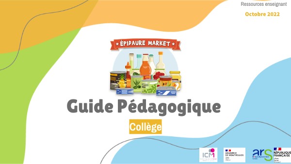« Epidaure Market » est un jeu sous forme de supermarché virtuel consacré à l'éducation pour une alimentation plus durable, à destination des jeunes.Pour les élèves de cycle 4 au collège, des séances ont été créées autour de ce jeu pour proposer un cadre qui s'appuie sur la littérature scientifique afin de cibler au mieux le changement de comportement des jeunes sur leurs choix d'achats alimentaires. Ce programme est élaboré par Epidaure, Département Prévention de l'Institut du Cancer de Montpellier (ICM) et par l'Académie de Montpellier et avec le soutien de l'ARS Occitanie. Ce guide permet de : - vous accompagner sur les séances de prévention afin de les préparer au mieux, - vous donner des ressources sur la thématique de l'alimentation durable, - vous proposer des pistes de poursuite d'activité. Des séances complémentaires peuvent être initiées pour un travail plus spécifique (voir la partie prolongement).