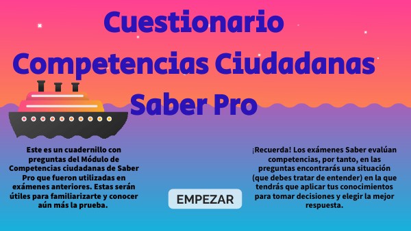 Este es un cuadernillo con preguntas del Módulo de Competencias ciudadanas de Saber Pro que fueron utilizadas en exámenes anteriores. Estas serán útiles para familiarizarte y conocer aún más la prueba.