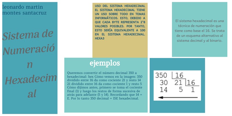 Queremos convertir el número decimal 350 a hexadecimal: hex Cómo vemos en la imagen: 350 dividido entre 16 da como cociente 21 y resto 14 21 dividido entre 16 da como cociente 1 y resto 5 Cómo dijimos antes, primero se toma el cociente final (1) y luego los restos de forma sucesiva de atrás para adelante (5 y 14). Recordando que 14 = E. Por lo tanto 350 decimal = 15E hexadecimal.