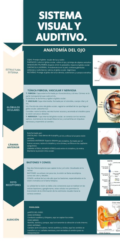 T. FIBROSA: Capa externa formada po rla esclerotica y córnea. Córnea: es la parte transparenet que cubre el iris. Esclerótica: le da forma y rigidez al globo ocular. T. VASCULAS: Capa intermedia, formada por el colorides, cuerpo ciliar y el iris. Iris: Porción de color del globo ocular, regula la cantidad de luz que llega al globo ocular. (absorbe luz) Coroides: nutre la retina, secreta humor acuoso y acomoda al cristalino para la visión cercana o distante. T. NERVIOSA: Capa interna del globo ocular, se conecta con los nervios opticos. (comienza la vía visual) Absorve luz y convertirlas en impulsos nerviosos y trasmitirlo al cerebro.
