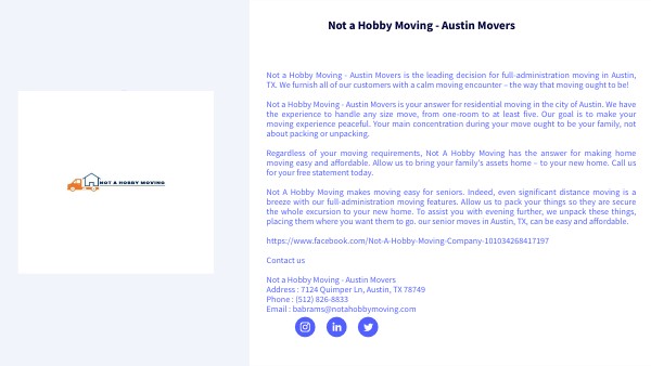 https://www.facebook.com/Not-A-Hobby-Moving-Company-101034268417197 Contact us Not a Hobby Moving - Austin Movers Address : 7124 Quimper Ln, Austin, TX 78749 Phone : (512) 826-8833