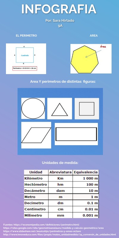 Fuentes: https://economipedia.com/definiciones/perimetro.htmlíhttps://sites.google.com/site/geometriaanalaura/medida-y-calculo-geometrico/area https://www.slideshare.net/JessicaVp1/perimetros-y-areas-octavo http://www.innoveduca.com/files/propis/mates_unidadmedida/24_conversin_de_unidades.html