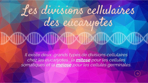 Il existe deux grands types de divisions cellulaires chez les eucaryotes : la mitose pour les cellules somatiques et la méiose pour les cellules germinales.