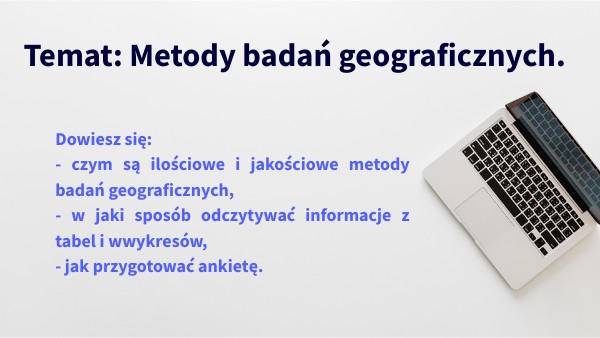Dowiesz się: - czym są ilościowe i jakościowe metody badań geograficznych, - w jaki sposób odczytywać informacje z tabel i wwykresów, - jak przygotować ankietę.