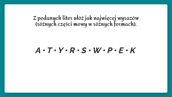 Z podanych liter ułóż jak najwięcej wyrazów (różnych części mowy w różnych formach).
