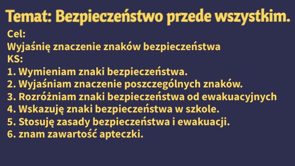 Cel: Wyjaśnię znaczenie znaków bezpieczeństwa KS: 1. Wymieniam znaki bezpieczeństwa. 2. Wyjaśniam znaczenie poszczególnych znaków. 3. Rozróżniam znaki bezpieczeństwa od ewakuacyjnych 4. Wskazuję znaki bezpieczeństwa w szkole. 5. Stosuję zasady bezpieczeństwa i ewakuacji. 6. znam zawartość apteczki.