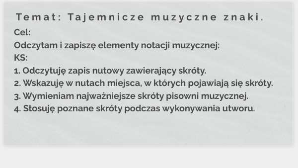 Cel:Odczytam i zapiszę elementy notacji muzycznej: KS: 1. Odczytuję zapis nutowy zawierający skróty. 2. Wskazuję w nutach miejsca, w których pojawiają się skróty. 3. Wymieniam najważniejsze skróty pisowni muzycznej. 4. Stosuję poznane skróty podczas wykonywania utworu.