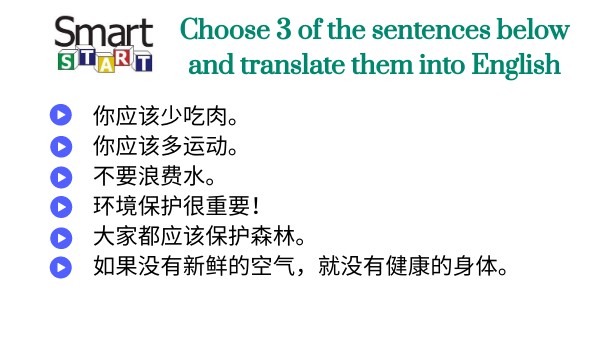 你应该少吃肉。你应该多运动。 不要浪费水。 环境保护很重要! 大家都应该保护森林。 如果没有新鲜的空气,就没有健康的身体。