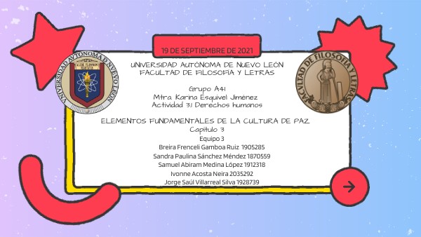 UNIVERSIDAD AUTÓNOMA DE NUEVO LEÓN FACULTAD DE FILOSOFÍA Y LETRAS Grupo A41 Mtra. Karina Esquivel Jiménez Actividad 3.1 Derechos humanos ELEMENTOS FUNDAMENTALES DE LA CULTURA DE PAZ Capítulo 3