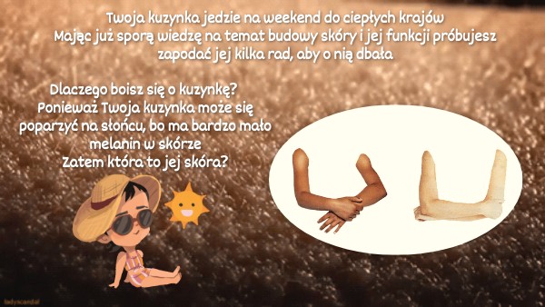 Twoja kuzynka jedzie na weekend do ciepłych krajów Mając już sporą wiedzę na temat budowy skóry i jej funkcji próbujesz zapodać jej kilka rad, aby o nią dbała