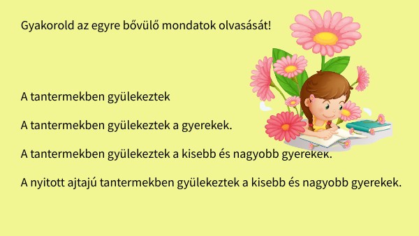 Gyakorold az egyre bővülő mondatok olvasását! A tantermekben gyülekeztek A tantermekben gyülekeztek a gyerekek. A tantermekben gyülekeztek a kisebb és nagyobb gyerekek. A nyitott ajtajú tantermekben gyülekeztek a kisebb és nagyobb gyerekek.