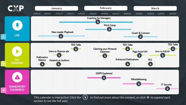 This calendar is interactive! Click the to find out more about the content, or click to expand each section to see the full year.