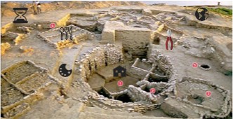 Document 1 : Croquis du village réalisé à partir des fouilles archéologiques 1. Bâtiment collectif circulaire avec des silos(espace de stockage) à grains et lieu de réunion. 3. Dépendance du bâtiment collectif 4. Maison à quatre pièces 5. Foyer collectif (espace pour le feu)