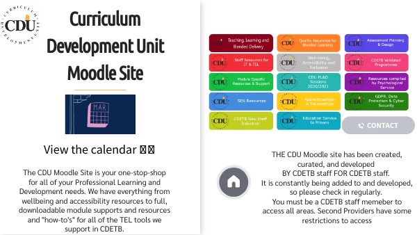 The CDU Moodle Site is your one-stop-shop for all of your Professional Learning and Development needs. We have everything from wellbeing and accessibility resources to full, downloadable module supports and resources and "how-to's" for all of the TEL tools we support in CDETB.
