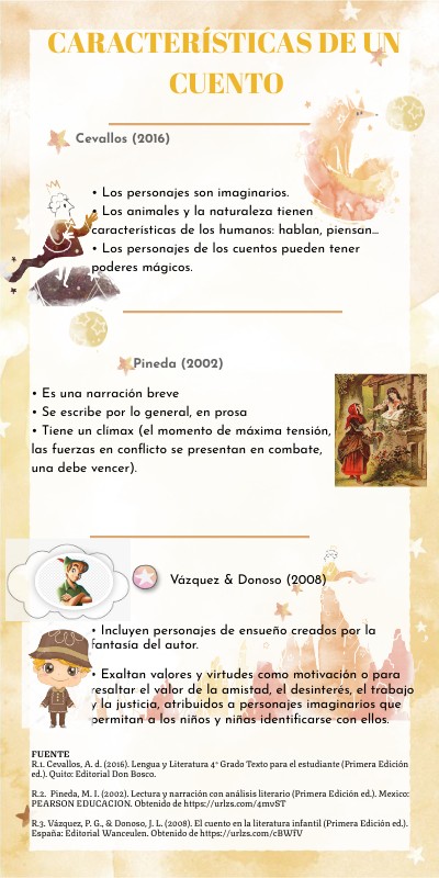 FUENTE R.1. Cevallos, A. d. (2016). Lengua y Literatura 4° Grado Texto para el estudiante (Primera Edición ed.). Quito: Editorial Don Bosco. R.2. Pineda, M. I. (2002). Lectura y narración con análisis literario (Primera Edición ed.). Mexico: PEARSON EDUCACION. Obtenido de https://urlzs.com/4mvST R.3. Vázquez, P. G., & Donoso, J. L. (2008). El cuento en la literatura infantil (Primera Edición ed.). España: Editorial Wanceulen. Obtenido de https://urlzs.com/cBWfV