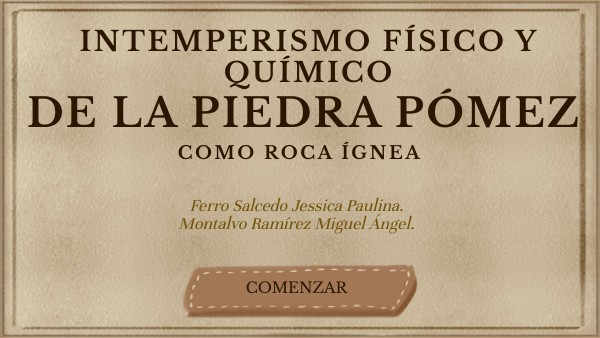 1.1. Piedra pómez (pumita): Roca ígnea volcánica que se caracteriza por ser altamente porosa y que densidad es muy baja, además está compuesta casi en su totalidad por vidrio volcánico, lo que le da una composición química félsica (más del 63% SiO2). La piedra pómez es una roca con alta porosidad, ligera (densidades entre 0,4 a 0,9 g/cm3), friable, eficaz aislante térmico y con propiedades puzolánicas. 1.2. El intemperismo Es la descomposición, desgaste, desintegración y destrucción de las rocas; por ejemplo, agua, aire, variaciones de temperatura, acción de organismos.