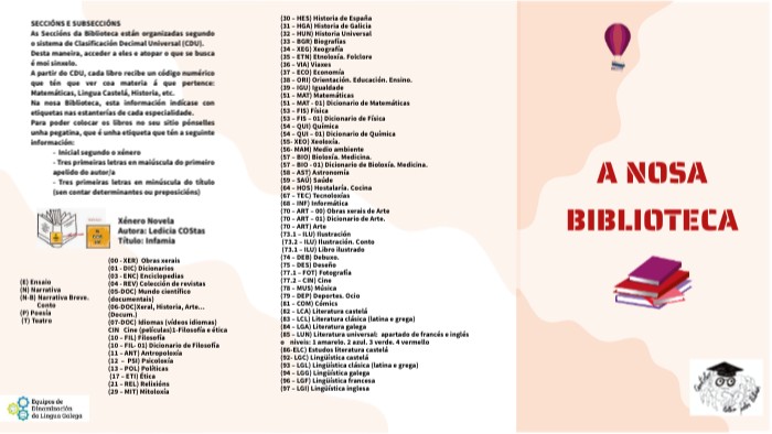 2.2. A organización do catálogoOs fondos da Biblioteca 1 están clasificados en función de tres criterios: A. Seccións e subseccións As seccións teñen carácter temático. Non teñen por que corresponderse cun departamento didáctico. Ex.: 59 – SAU, sobre Saúde. As subseccións precisan o tipo de libro. EX.: 70 – ART identifica un libro de arte; 70 – ART – 01, un dicionario de arte; 70- ART-03 unha enciclopedia. B. Xénero Identifícanse no rótulo do libro coa inicial correspondente:(E) Ensaio (N-B) Narrativa Breve. Conto (N) Narrativa (P) Poesía (T) Teatro C. Espazos propios dentro da Biblioteca 1:1. Curruncho das Ciencias.2. Cómic.3. A outra mirada (Orientación, inclusión, Feminismo, GAL, Igualdade...) 5. Dentro da Narrativa (N):- Ciencia ficción e Fantasía.- Xénero negro, detectives e medo.