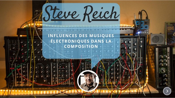 Steve Reich est un représentant de la musique répétitive américaine, aussi appelée musique minimaliste (courant très important de la musique savante américaine à partir des années 1960.