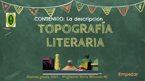 Se conoce como topografía a aquella figura literaria que consiste en hacer una descripción completa y detallada sobre un lugar, un paisaje o un pueblo.Por lo general, se presenta en pasajes descriptivos para referirnos las características y las particularidades de un escenario.