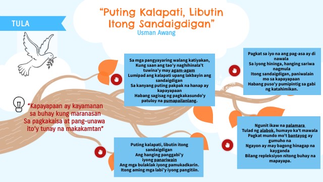 Puting kalapati, libutin itong sandaigdigan Ang hanging panggabi’y iyong panariwain Ang mga bulaklak iyong pamukadkarin. Itong aming mga labi’y iyong pangitiin.