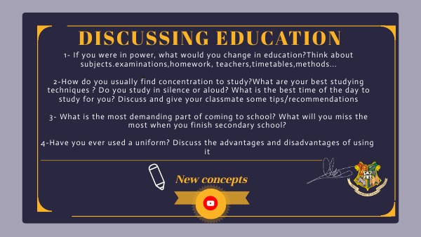 1- If you were in power, what would you change in education?Think about subjects.examinations,homework, teachers,timetables,methods... 2-How do you usually find concentration to study?What are your best studying techniques ? Do you study in silence or aloud? What is the best time of the day to study for you? Discuss and give your classmate some tips/recommendations 3- What is the most demanding part of coming to school? What will you miss the most when you finish secondary school? 4-Have you ever used a uniform? Discuss the advantages and disadvantages of using it